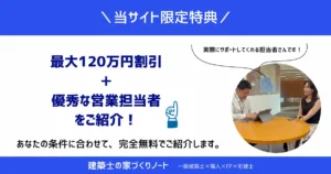 「えっ、そんな割引あるなんて知らなかった…!」実は、ハウスメーカーや工務店には、「知ってる人だけが得する」紹介制度があります。 当サイトでは、 最大120万円の紹...